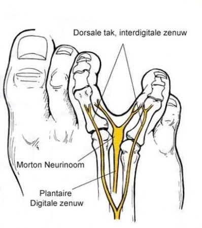 Eén van de zaken die zeer veel pijn in de voorvoet en de tenen kan veroorzaken is een Mortonneurinoom. Dit is een situatie waarbij een zenuw ingekneld geraakt en gaat zwellen op zijn verloop tussen de tenen. De patiënten hebben meestal een branderige of stekende pijn in de zone van de 3de en de 4de en soms ook de 2de teen. De pijn kan heel hevig zijn en sommige patiënten kunnen de zone tussen 2 tenen heel goed aanwijzen. De pijn is in vele gevallen zeer intens, schietend, soms meer zeurend. De pijn straalt geregeld uit tot in de tenen. De last wordt erger met het dragen van schoeisel. Meestal gaat het beter door te rusten, de schoen te verwijderen en de voet in te masseren. De pijn blijft zich situeren in de voorvoet en straalt niet uit naar de achtervoet of de enkel.