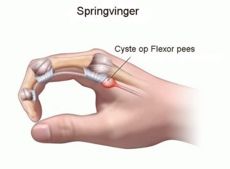 De flexor pezen zijn verantwoordelijk voor het plooien van de vingers en de duim. Deze glijden doorheen verschillende kleine tunnels, zodat zij mooi op hun plaats blijven zitten in onze hand en in de vingers. Wanneer één van deze pezen geïrriteerd geraakt en begint te zwellen of een cystische verdikking ontwikkelt, kan het glijden in deze kleine tunnels bemoeilijkt worden en pijnlijk worden. In geval van een springvinger zorgt een verdikking op de pees voor een blokkage van de pees vóór de ingang van een dergelijk tunneltje en bij het aandringen op de beweging kan deze plots door de tunnel schieten en het verspringend gevoel veroorzaken dat men heeft bij springvinger. Wanneer de cyste te dik wordt, kan deze volledig geblokkeerd geraken aan de ingang van dergelijke tunnel en kan de vinger niet meer gestrekt worden.