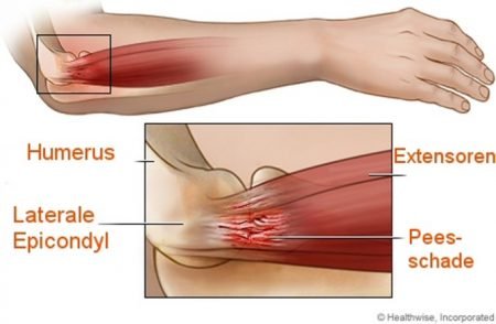 - Cortisone injecties in de pijnlijke plek thv. de elleboog kunnen zeer efficiënt zijn om de pijnklachten snel te verminderen. Op langere termijn echter is het niet efficiënter dan de voorgenoemde behandelingsmethodes. Het is belangrijk dat, indien een infiltratie gegeven wordt, en de pijnklacht na enkele dagen weg is, dat het toch nog steeds nodig blijft om de arm te laten rusten gedurende enkele weken, anders zal het sowieso niet efficiënt zijn. Cortisone injecties hebben uiteraard bijwerkingen, zoals bv. atrofie van het vetweefsel onderhuids, verkleuring van de huid die permanent bleker wordt thv. de injectieplaats, beschadiging of verzwakking van de kwaliteit van de pees (zeldzaam)